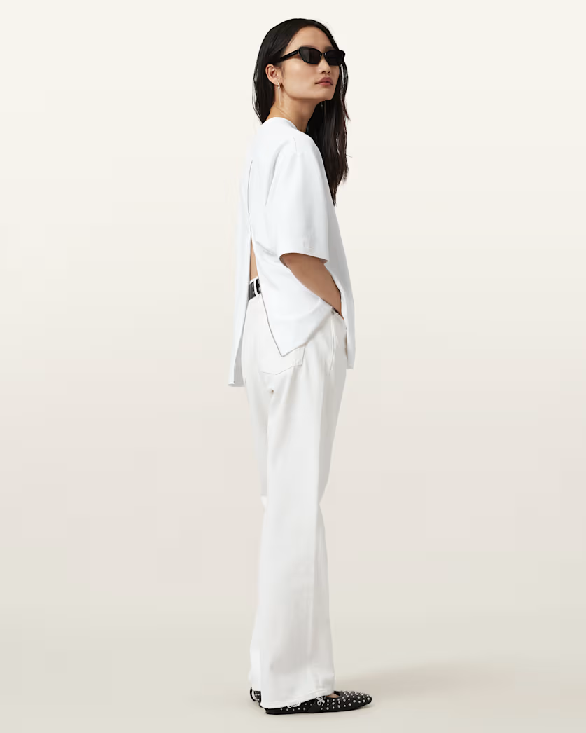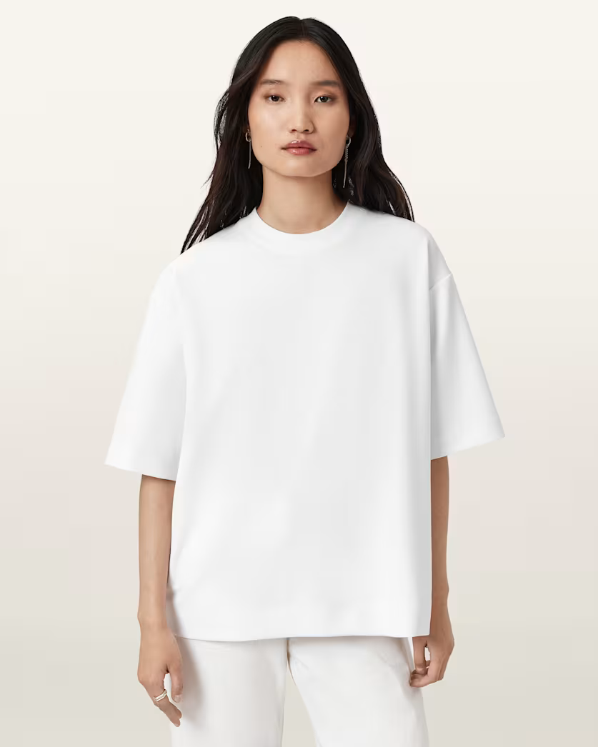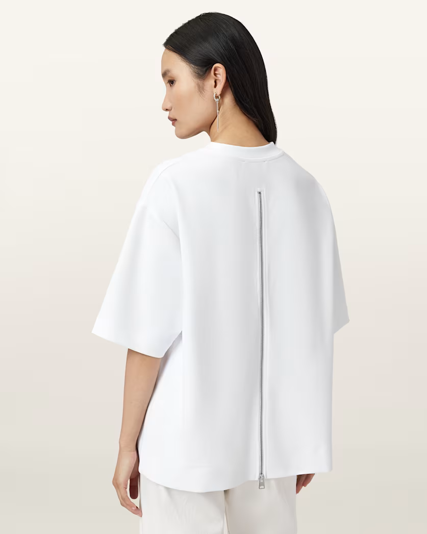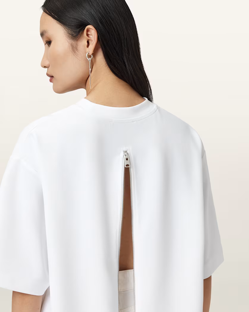 טי שירט קצרה לנשים מבית המותג אולסיינטס. בגזרת אוברסייז, עם מפתח עגול, שרוולים רחבים, בשילוב רוכסן סגירה בגב.