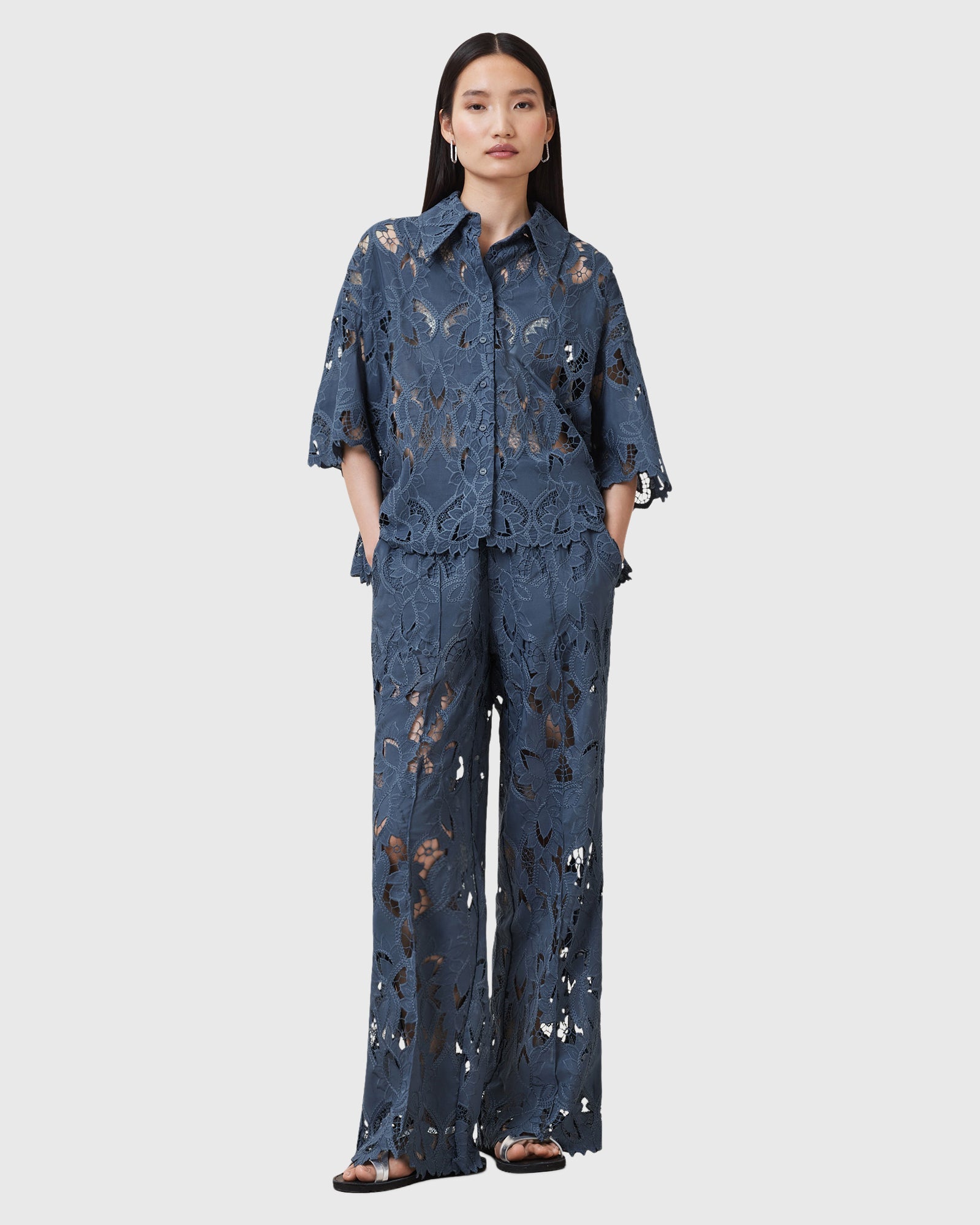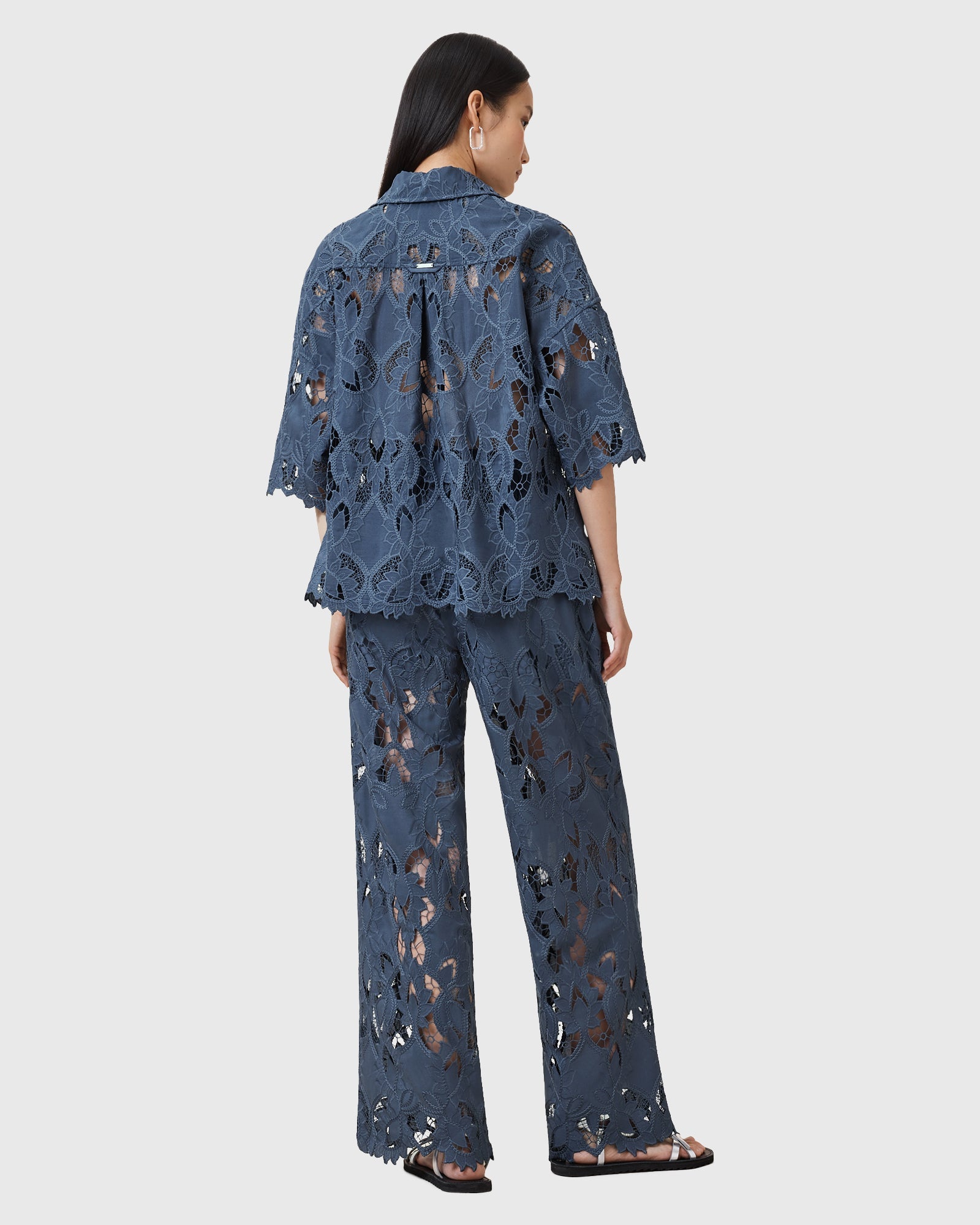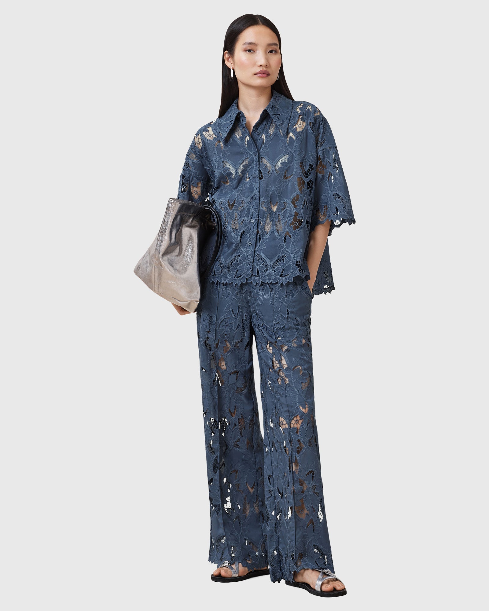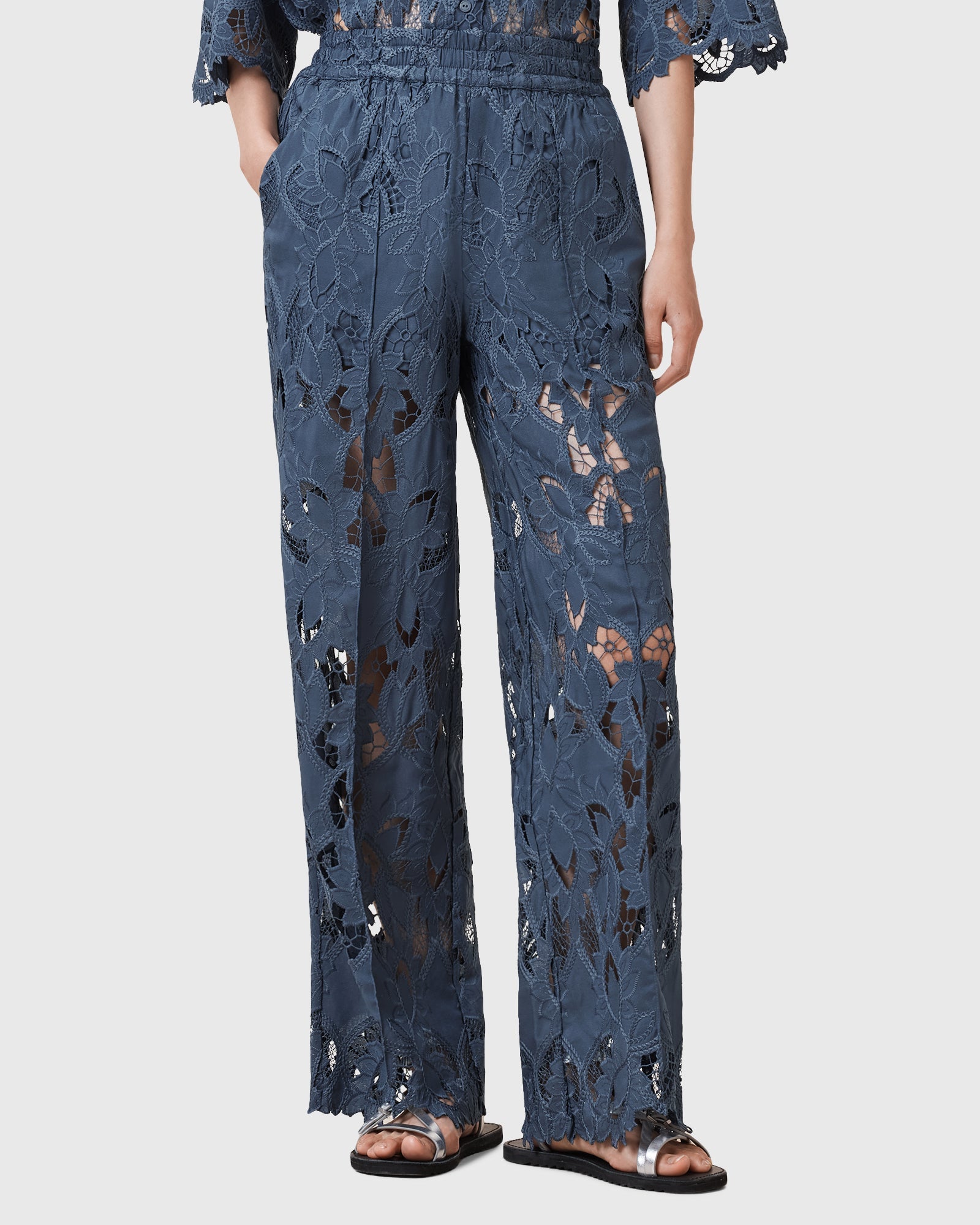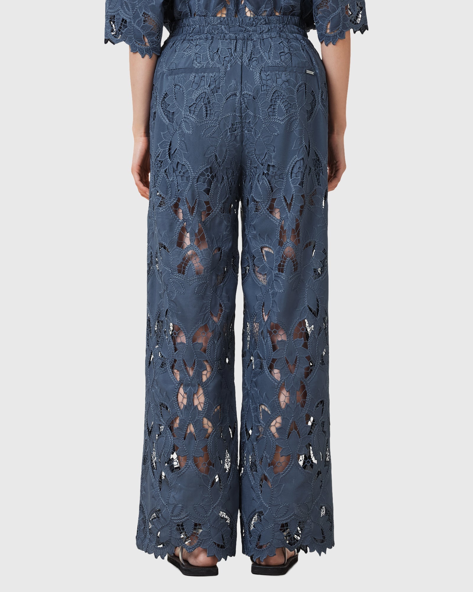 מכנסיים ארוכים לנשים מבית המותג אולסיינטס. בגזרה רחבה, עם גומי במותן מבד תחרה מיוחד.