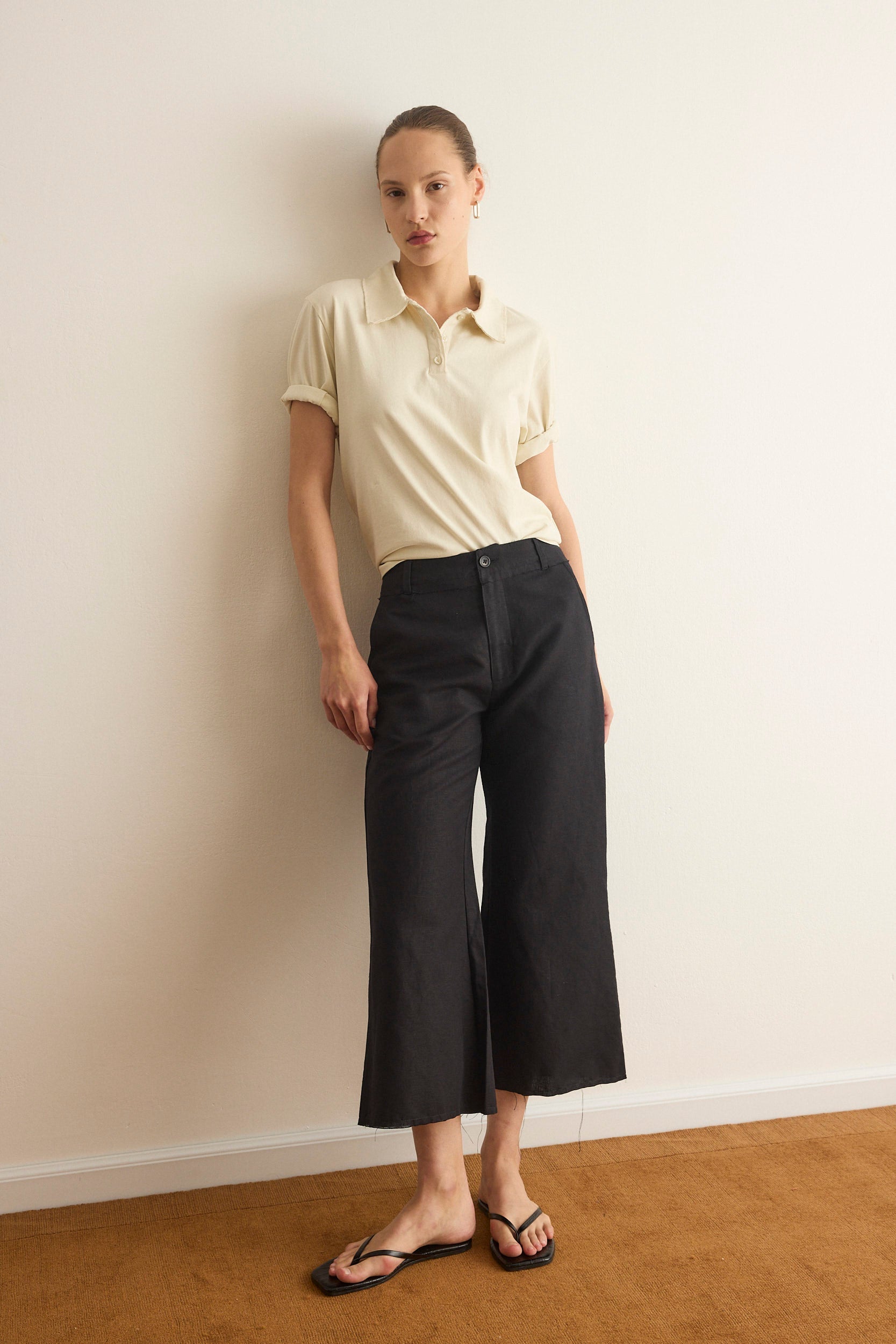 מכנסי קפרי באורך 7/8 בגזרה מתרחבת ודיטיילס פרימות בסיומת ,עשוי מבד פשתן נעים וקייצי.